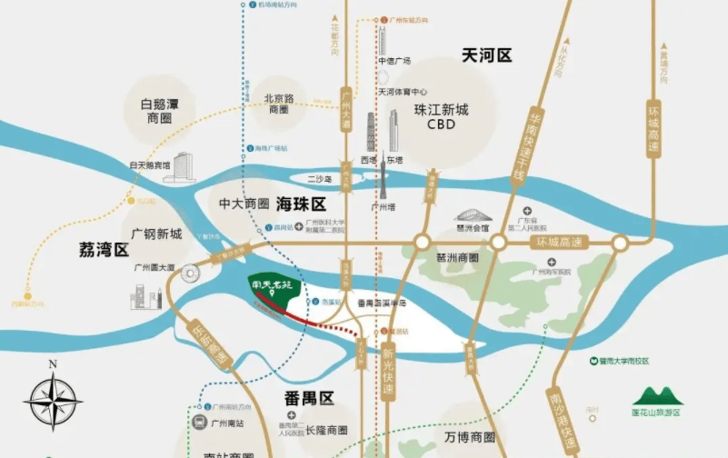 :项目紧邻南大干线、东新高速等主干道,自驾出行十分便利。经此路网,30 分钟内可畅达珠江新城、万博、琶洲三大 CBD,1 小时内即可覆盖大湾区主要城市。这种高效的交通网络,让居住在洛溪岛的业主能够轻松实现“工作在CBD,生活在岛居”的理想状态。