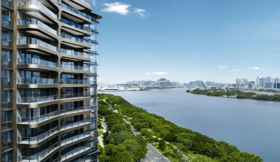 :容积率仅 0.99,建筑采用全南北阵列式排布,前后无遮挡,搭配 2.3 公里浓荫江堤和 5 个下沉式花园,居住密度极低,舒适度极高。