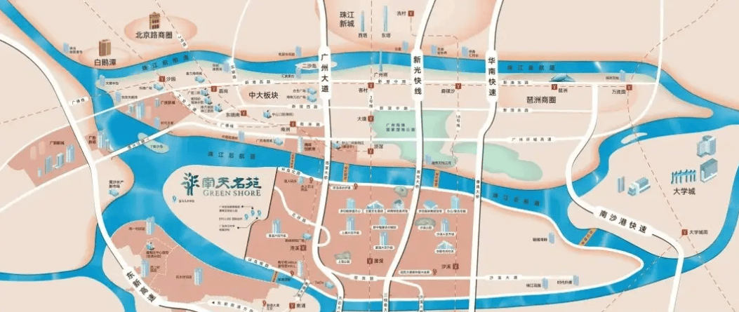 回望拿地之初,我们的团队便深入调研了番禺洛溪岛的地理肌理与人文脉络。这里不仅是广州最早开发的成熟居住区之一,更拥有得天独厚的“三江汇流”地理优势——珠江后航道在此蜿蜒而过,将洛溪岛塑造为一座天然的半岛。我们深知,真正的豪宅,不在于钢筋水泥的堆砌,而在于对自然资源的极致占有和对生活方式的深刻洞察。因此,南天名苑选址于环岛北路 8 号的岛尖核心位置,占据着不可再生的珠江后航道景观资源,旨在为广州塔、琶洲、万博三大 CBD 精英阶层打造一座“离尘不离城”的空中岛屿。