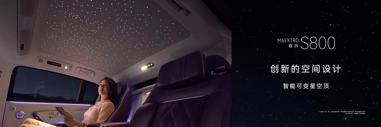 智能可变星空顶,呈现满天星光、北斗七星与流星雨特效。智能追光系统,追光灯分区布局点亮仪式感。尊界S800行政四座后排采用轿车级双零重力座椅布局,配备ActiveSafe双零重力座椅,创新主动安全设计,联动ADS自主调整座椅姿态。