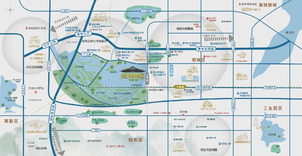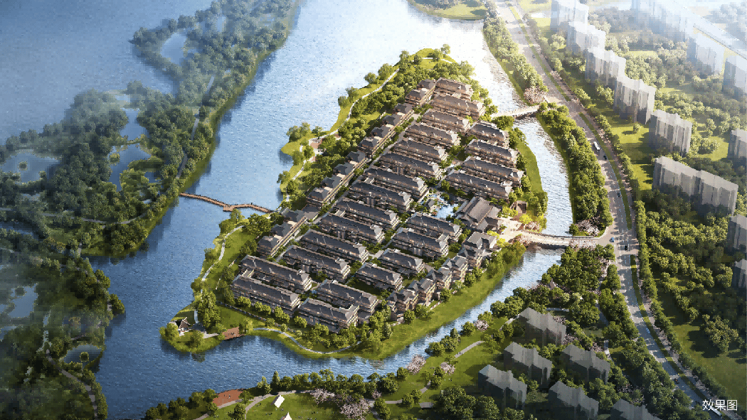 项目最大的特色之一,是它被360度的天然水系环绕,形成了一个真正的“全岛”住区。依靠虎丘湿地公园的自然肌理,只通过两座桥和一条小径与外界相连,私密性和归家仪式感直接拉满。这种苏州主城岛居的生活体验,在苏州主城独一无二,为追求静谧与尊贵的家庭提供了理想选择。